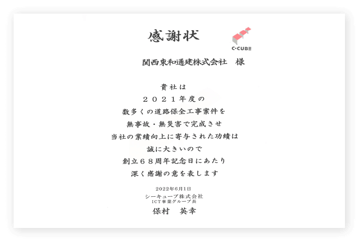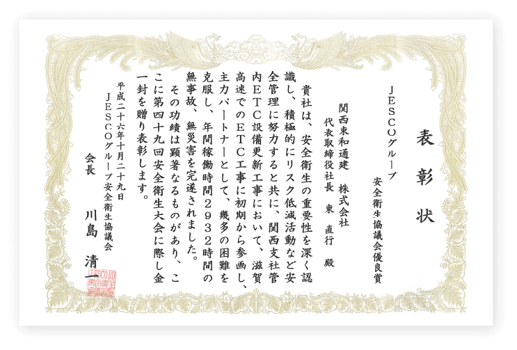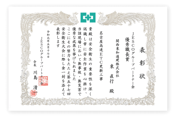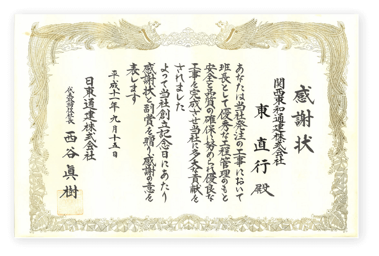 長年の実績により多くの感謝状や表彰をいただき、信頼ある企業としてご支持いただいています。
