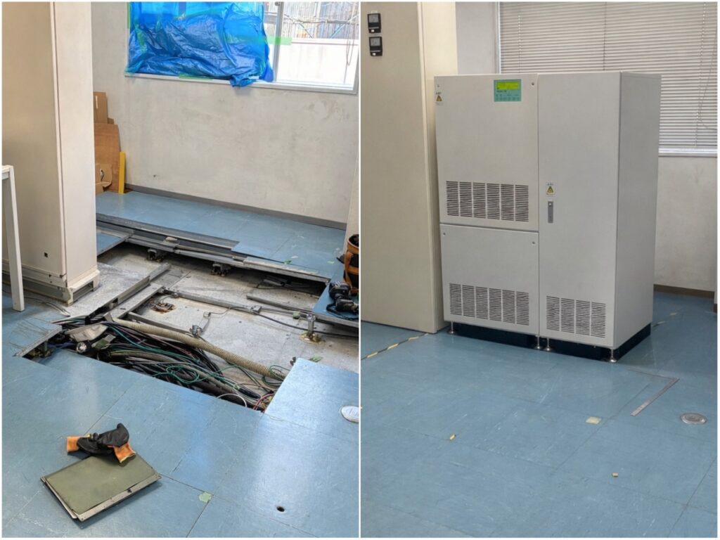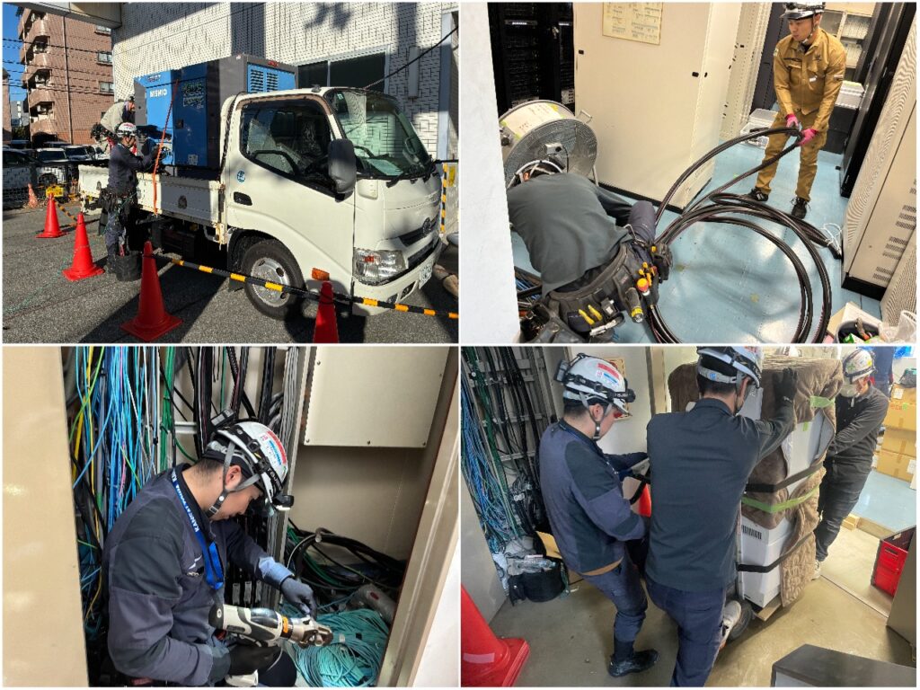 今回の工事では、設備移設に伴い一時的に電源の切り替え作業が必要となるため、事前に発電機を設置し、仮設電源へ切り替えた状態で作業を実施しました。重要設備の電源を確保しながらの作業となるため、事前の段取りや安全確認を徹底して施工を進めています。